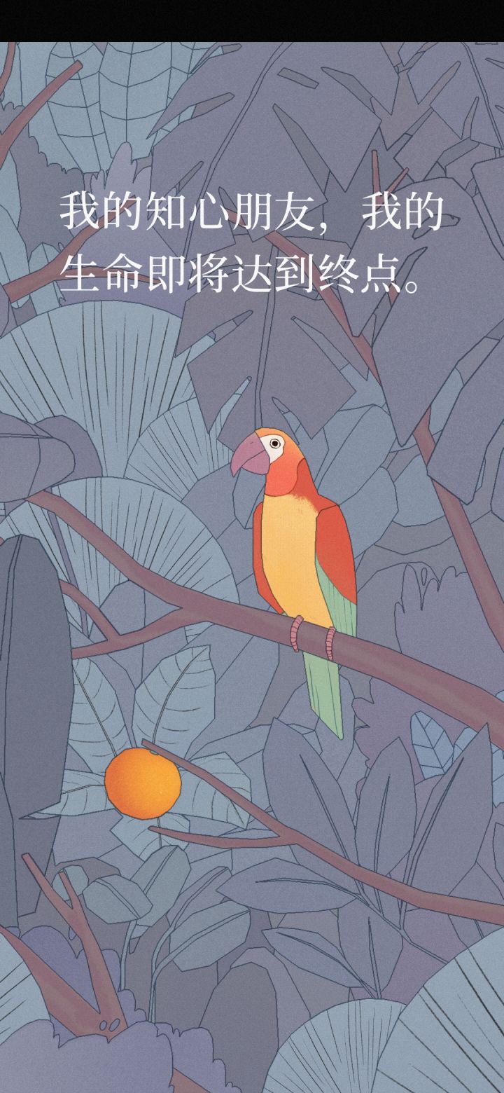 这是你陪伴我的最后一天,你早上和我告别,我现在也想和你告别。我亲爱的朋友,你说“三人成虎,三鸟也是”所以你只有我一个朋友,我身边有好多人,他们是父母,同事,同学,恋人,可他们都有自己的生活,没办法像你这样陪伴我,没办法像你这样安抚我,看他们说只要我愿意等,你就会回到蛋里重新来到我身边,我想和你说,我愿意等,我会等你回来。