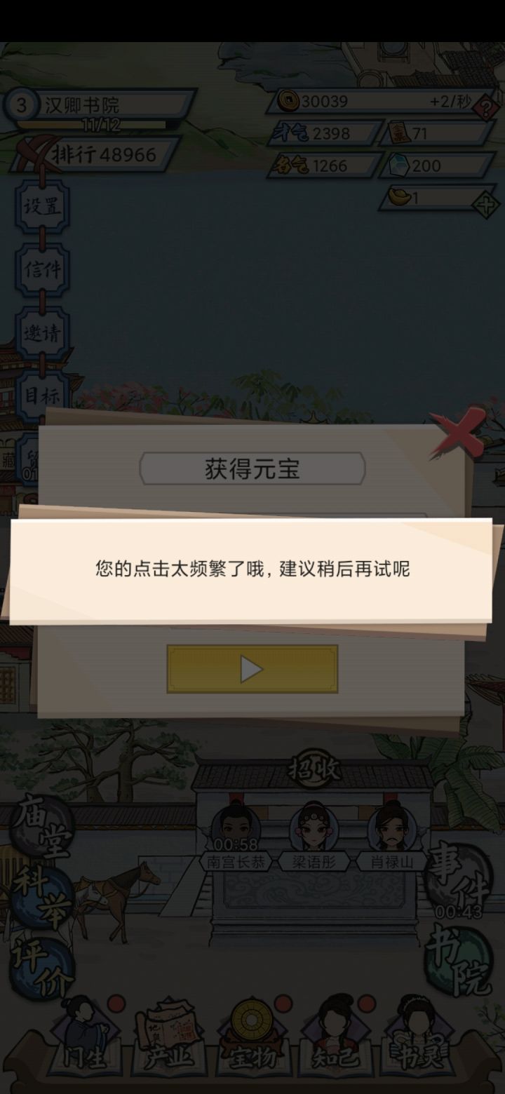 1,刚开始肝(看广告)就对了,肝两天,基本上铜币,颜玉,元宝不缺,金票永远不够用,金票优先升级开小灶人数,然后再宝物。2,等级越高,门生品质越高。招生界面只留当前最高品质的,其他拒收,然后看广告刷新资质,直到绝无仅有,举世无双,空前绝后后招收。3,后期比较无聊,就是2分钟一次开小灶,刷满100次就科举。