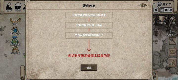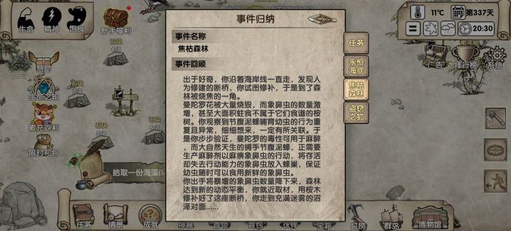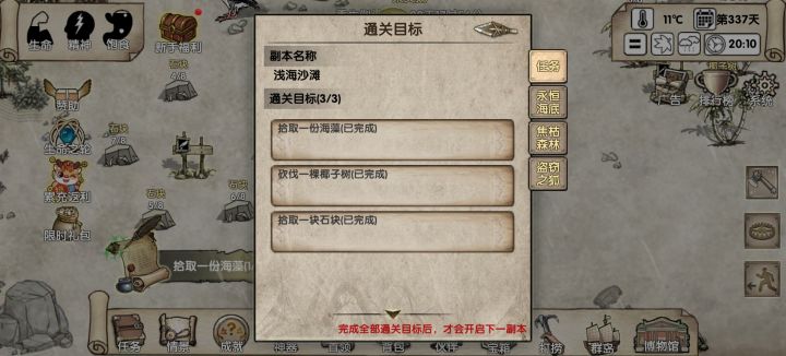 #单机游戏 浅海沙滩-这一章共有四个任务主线任务很简单-略【任务-永恒海底】时间⌚??海底漩涡出现-带上钳子和撬棍进入。钳子清理海底垃圾-⌚??遇到珊瑚鱼攻击,得到珊瑚角配(鱼饲料)-撬棍清理海底包厢-攻击章鱼🐙-打开章鱼宝箱【任务-焦枯森林】森林失火-猜两次蜂和虫和花🌸的关系-得到蜜蜂🐝,进行攻击,修桥。【任务-盗窃之狐】用弯竹陷阱得到呆头鹅-带入攻击狐狸🦊,即可成功急