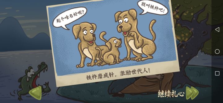 点小孩,奶奶在喊铁杵磨针时,把小黄狗移到奶奶手里(要是不及时,婆婆会敲碎大石。其他路线✗:-点鳄鱼,婆婆会把铁棍扔鳄鱼嘴里。-点婆婆,婆婆会抽查小孩知识,敲断大树。-点小狗,小狗只会汪汪叫。