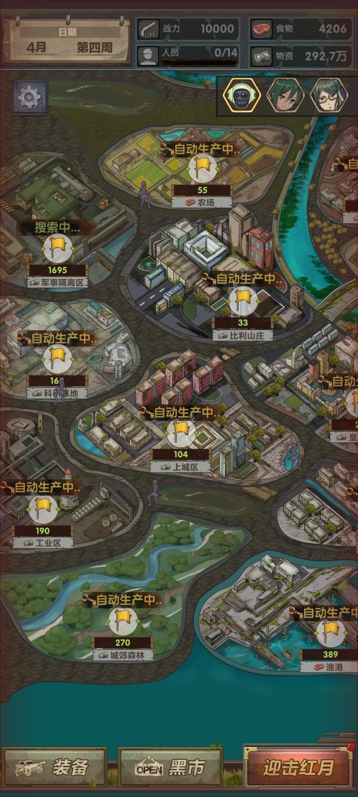 第一次红月之后尽量把开锁匠拿到。。有钱就把车子更新换代。后面的卡能看广告就看广告。尽量别选没用的。。顶多选个厨师。防止缺食物。。另外黑市基本就没用了(不要升仓库管理员)。只买暴跌的就行