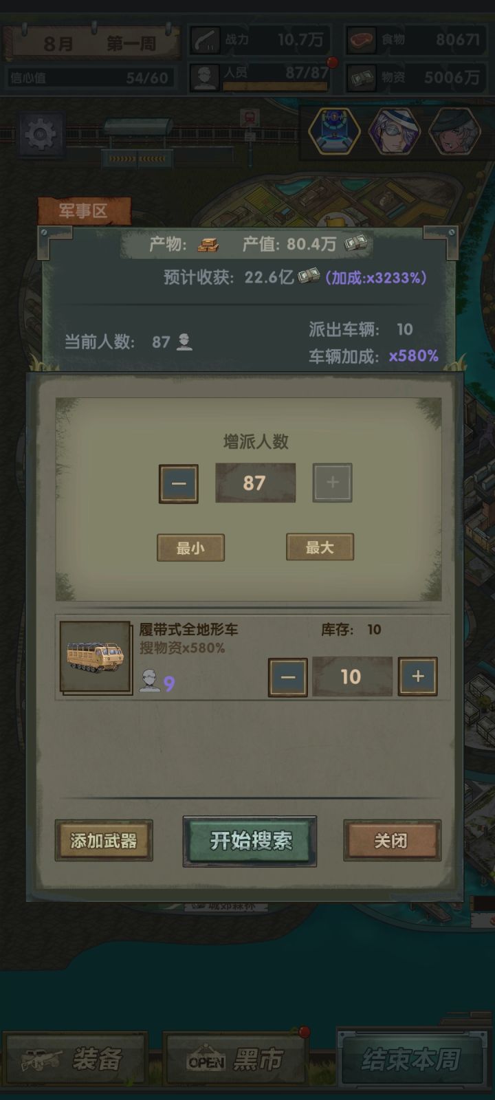 第二月,开局遇到爆米花可以选,sl刷点钱换大亨买食物升级农场和公园,探员继续探,打当前战力最高能搜的,能开安全区就开(之后农场满了留几万食物就可以换掉大亨)