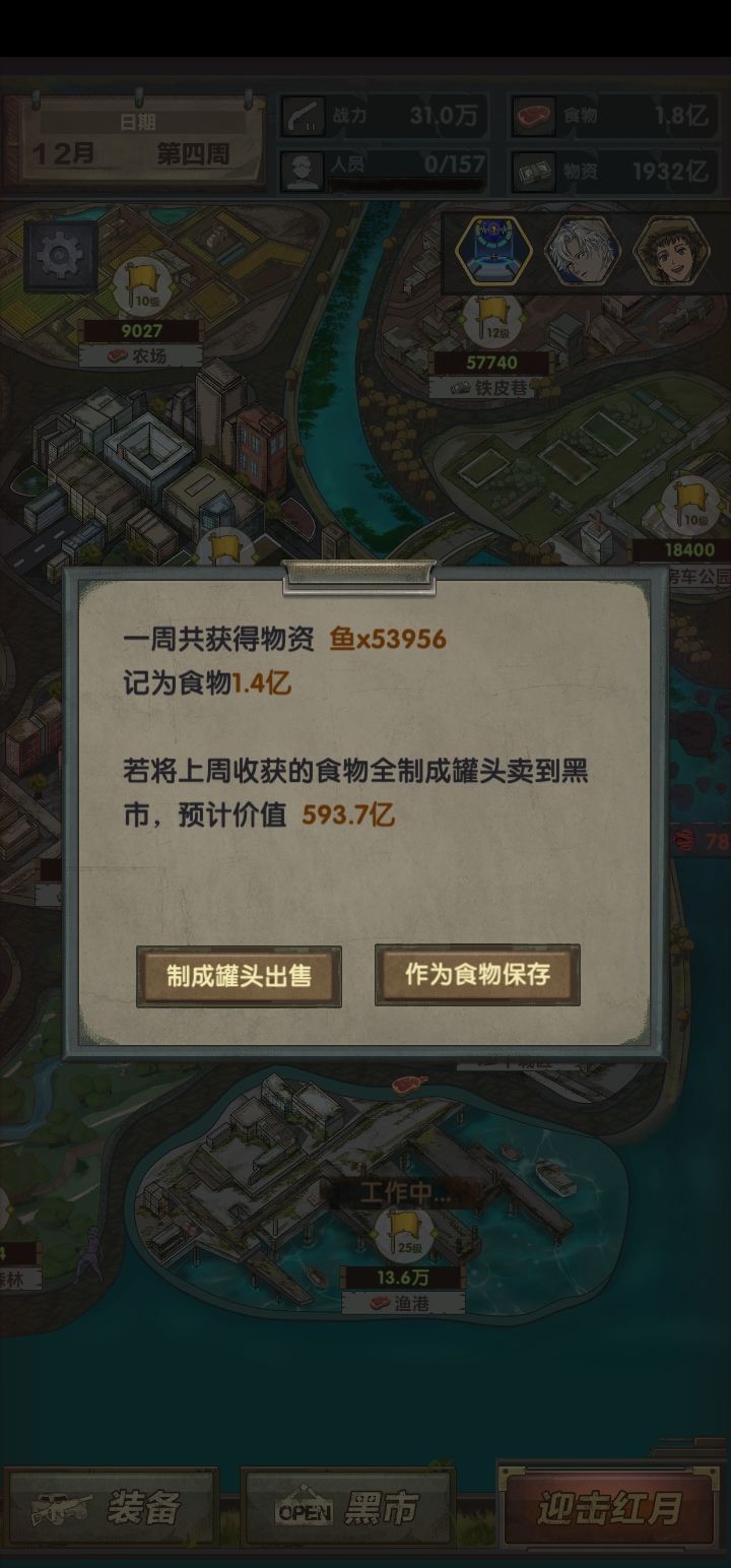 4、头两个星期,通过黑市和罐子哥卖罐头,尽量凑够战力打农场,只留一个兵探索农场,其他继续采集食物做成罐头换钱。