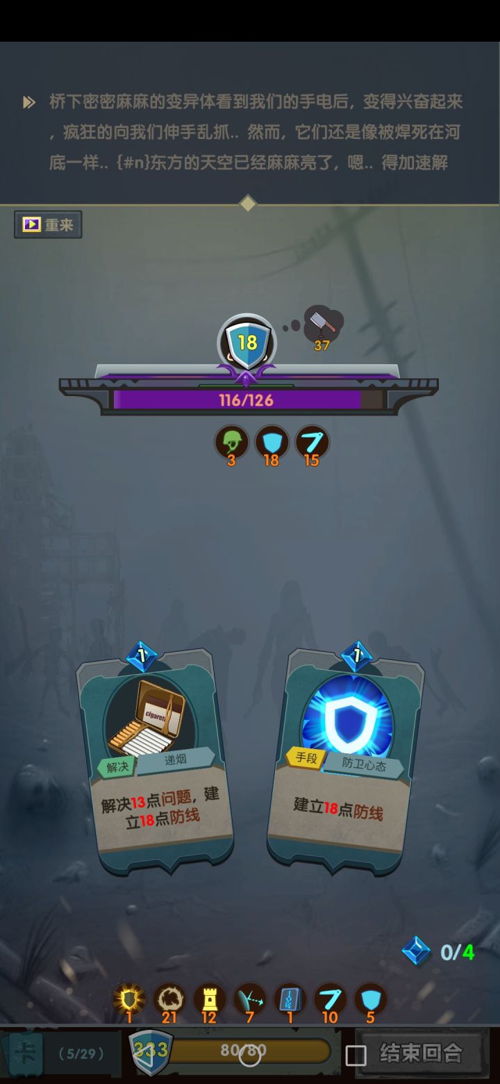 解决问题回合结束点快了容易卡住;牌组不增减牌牌序都不变,经常遇到一手攻击或一手防御;下面0血不死(回合结束是之后点的)