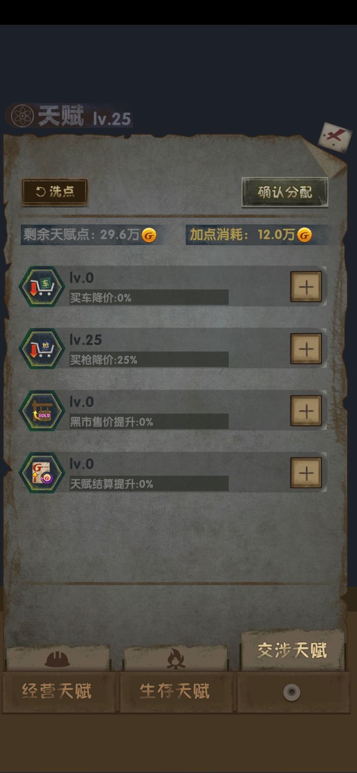 1、更新后买枪天赋bug。目前我的天赋是买枪25级(-25%价格),但是,游戏里实际上只减了20%2、卡人口bug没有修复。卡人口bug触发后重开,会从卡的那个回合开始,金钱、人口、装备和初始一样。3、连点人物升级两次技能bug没修复