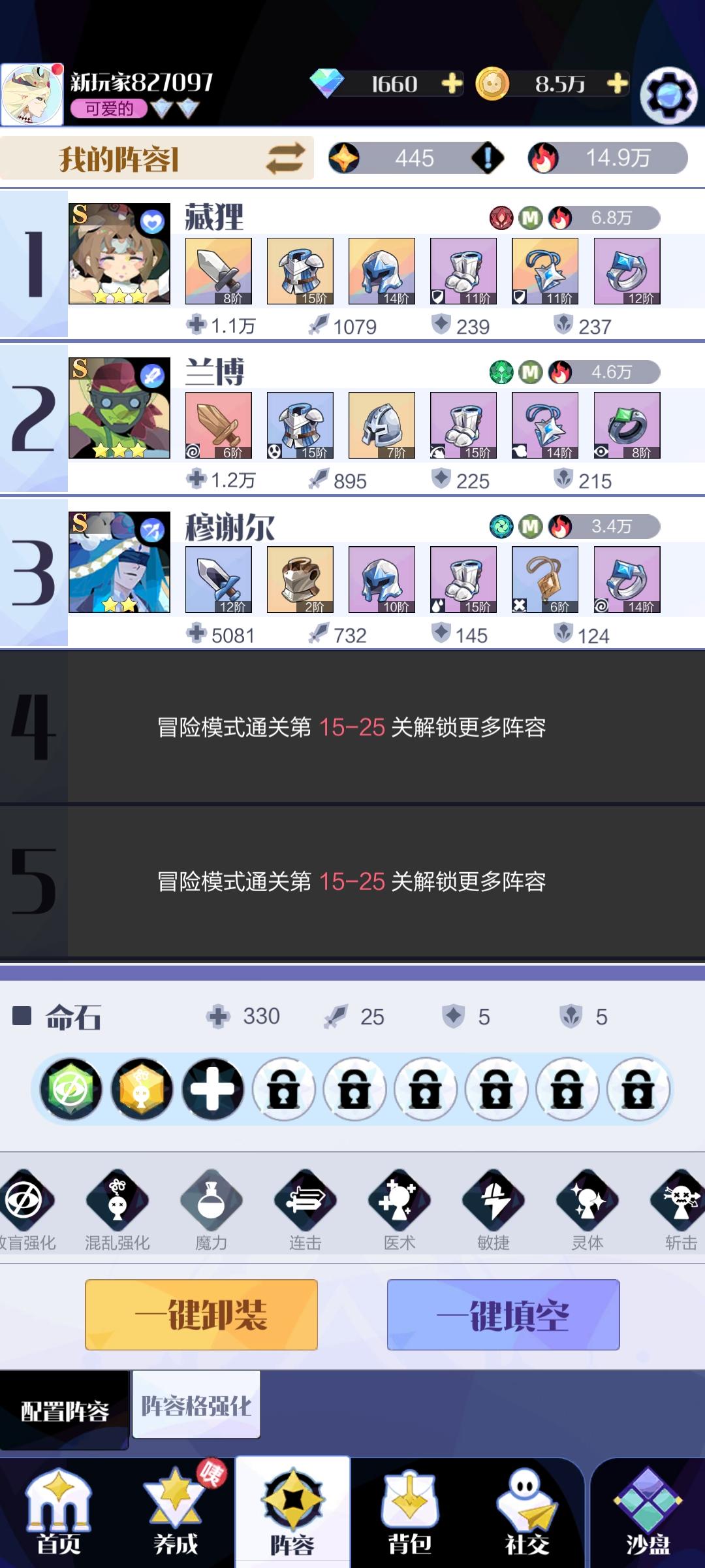 刷到22-30了,推荐一个平民阵容,没有至臻S,抽卡欧气最高2600。。。达摩3星可以冰冻对面,可惜我太非了,只有2星,输出也很高