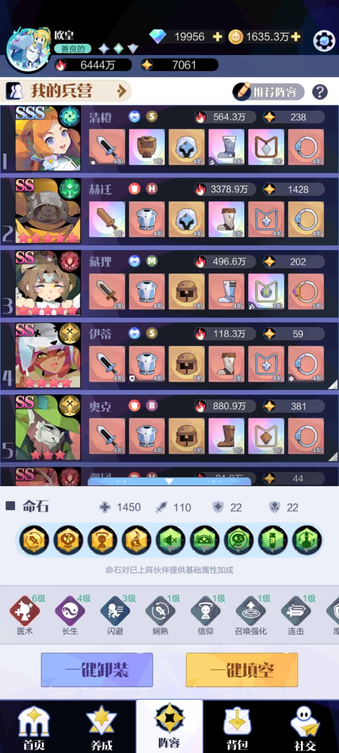 目前刚刚升九人口,还在慢慢凹关卡,阵容无脑抄就是,一次不行就试一百次,我这低配都行你们更可以前六个顺序记好,用来六人口过度,后面七八九号位置暂时先将就着用,顶配我看攻略说是咩咩和拉斐尔最佳,我星级太低,技能太少,不上了前两天的双人组队没打亏死,以后一定要记得晚上八点不见不散,不然这玩意奇缺,不说了,继续凹关卡了,总的一句话,无脑抄就行了,不要和我杠,杠就是你对(万千阵容之一,纯粹分享而已)9