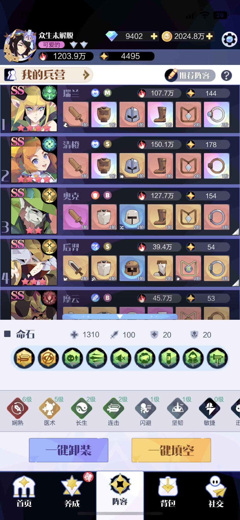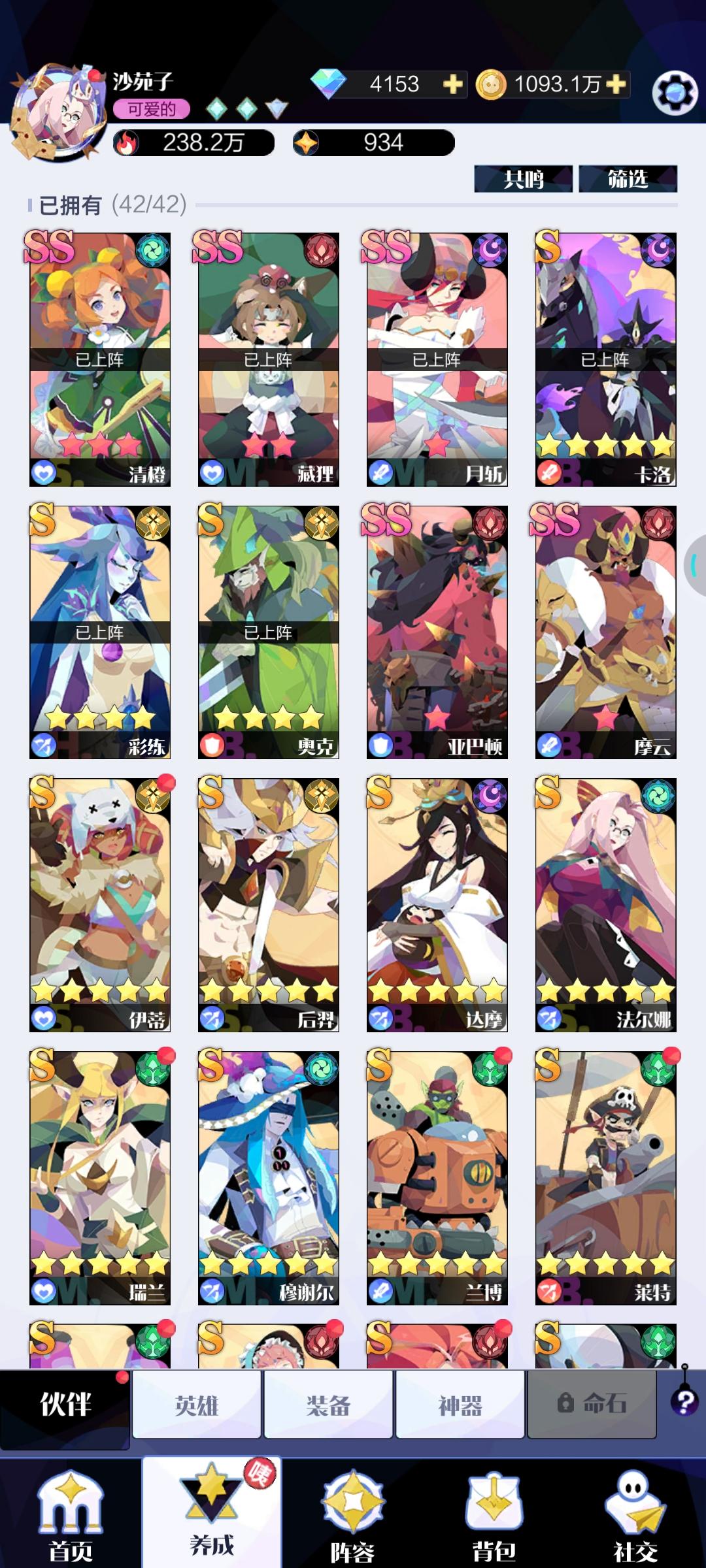 过关伤害忘记截图了,人物74梅 与共 荒芜 灵引,阵容瑞兰 清橙 奥克 后羿 摩云 孙悟空 观凤 藏狸 伊月全程无脑拖出领域 用灵引与共堆奥克我奥克最后没到传说 290来万战力吧