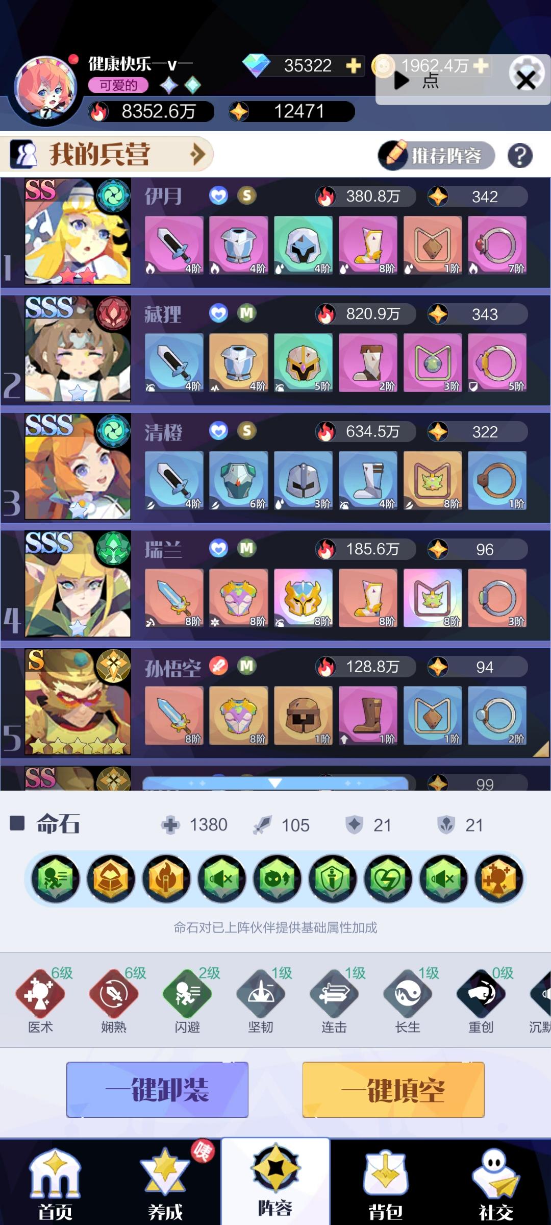 用的樱,平均消下去三个橙色,1000W。带的六娴熟六医术,迁赫清城依月,没打过去。换成卡洛清城达摩,也没打过去。。。暂时恶心到了不想再消了答:)用评论区推荐的青橙,伊月,奥克过的,多利用樱的被动在两个绿的时候合出蓝色,最后合出三个橙色。1000W过的