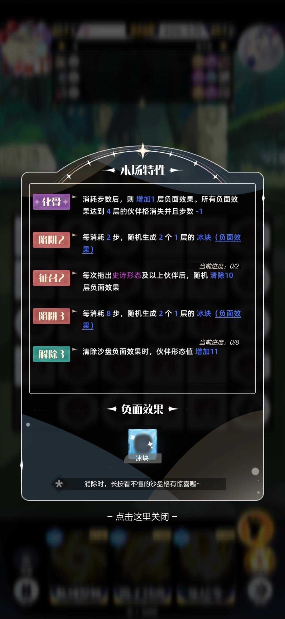 35—50关攻略沙盘伙伴:只掉落前三名伙伴格沙盘战斗力:从零消除队伍:英雄:贝萝伦技能:队列整顿、携手共进、集结令通关方法:合成任意英雄到紫色品质冰块处理方法:冰块旁边消除英雄技能召唤全部伙伴被冰冻的伙伴格不会因为下方合成减少伙伴格掉落到下方沙盘格清除冰块提升被消除冰块对应伙伴的形态值合成出一个红色伙伴冰块出现规则:两步操作之后只会在前两行(横向)出现2格1层