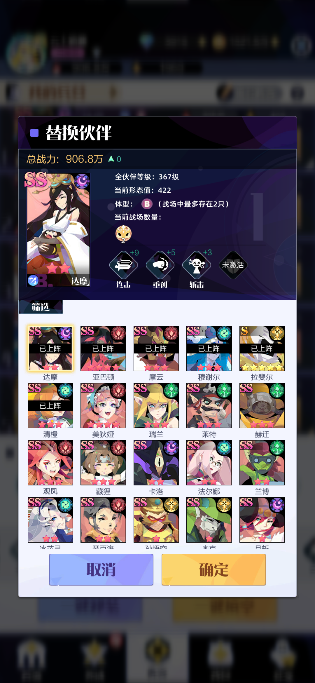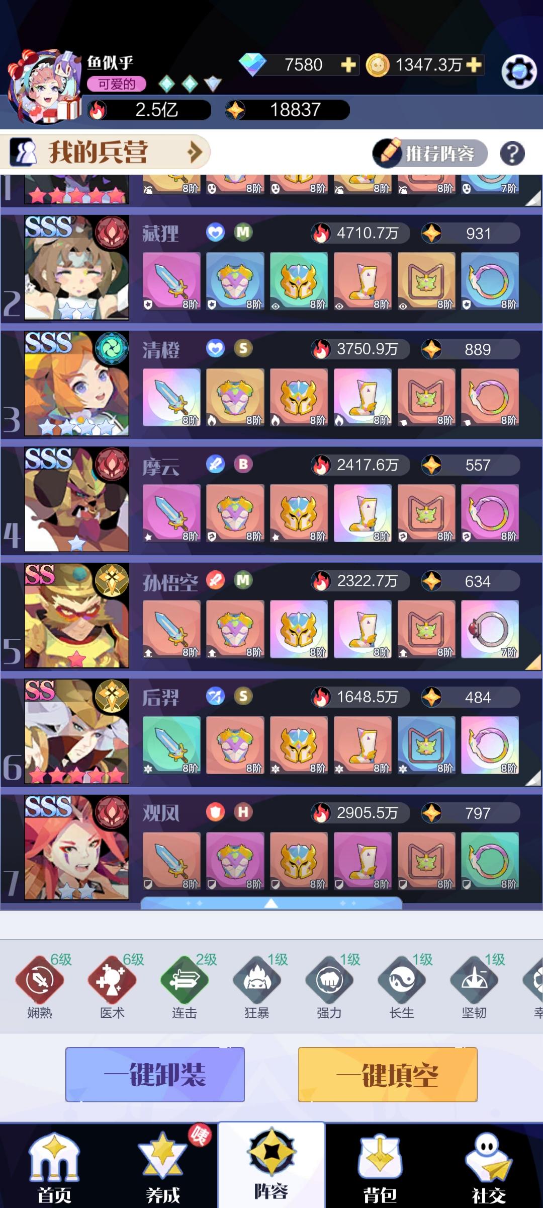 先放上阵容清橙和藏狸为必须,形态值为二三位,班加德为必须,保证都是紫色稳定眩晕对面后排就行,连携主要是娴熟和先机保证技能越早放越好,为什么后面会说,主c看小关的阵容是远程为主还是近战为主来决定谁是一位形态值,远程为主的带彩练(新发现的黑科技,必须ss才能用),近战为主的带赫迁,别的随便带带凑连携。消除用梅造一个究极大哥。赫迁大家都知道为什么了,我这边就不说了。关于彩练,技能优先索敌小形态,对远程