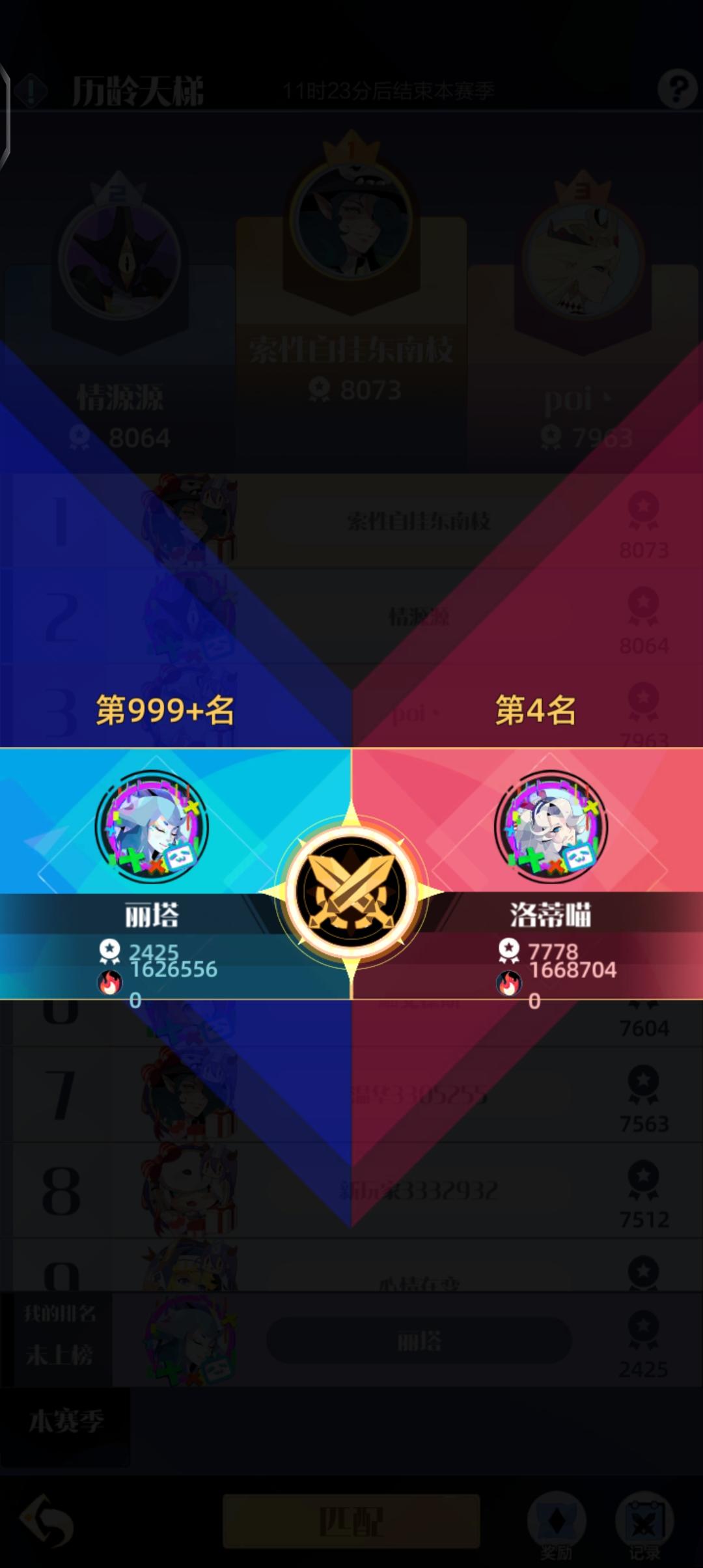 你这个天梯匹配啥情况,撞了好几次前十了。有时候按积分有时候按战力?统一成积分呗,要不然分冲的有点慢啊,一直撞前排大佬谁受得了