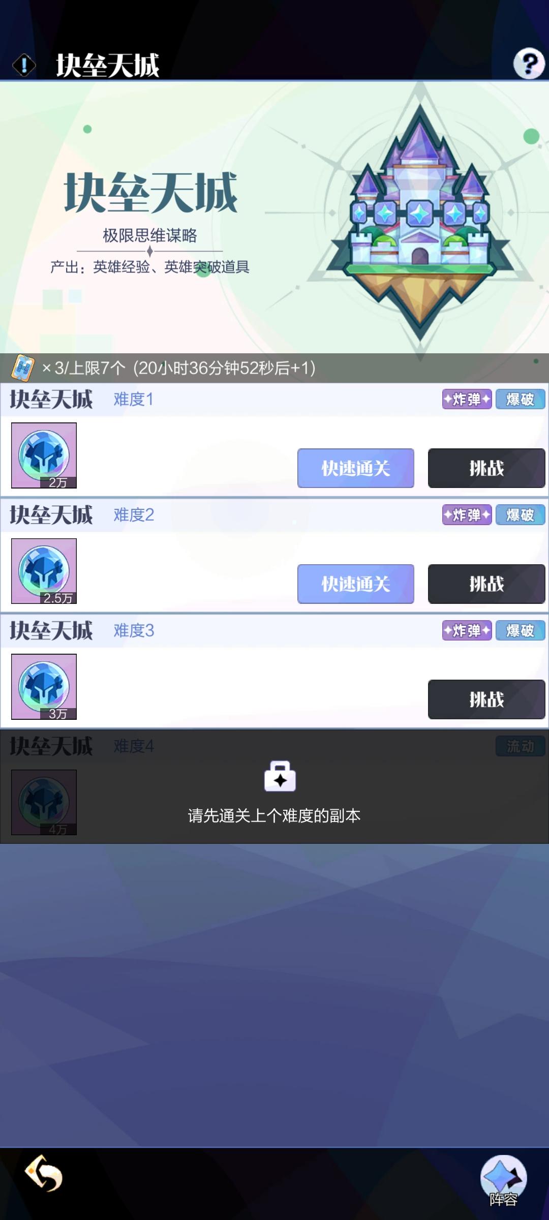 沙盘核心不够,只有副本能掉,副本每天每个副本就回复一次,暂时进度是掉65个,太少了,商城的也买完了。虽然凑积木也慢,其实不着急,但是还是有点不爽的感觉,可以在剧情里加点沙盘核心掉落,反正剧情也掉积木,难度也推不快,应该正好能补足资源进度。以上,加油~