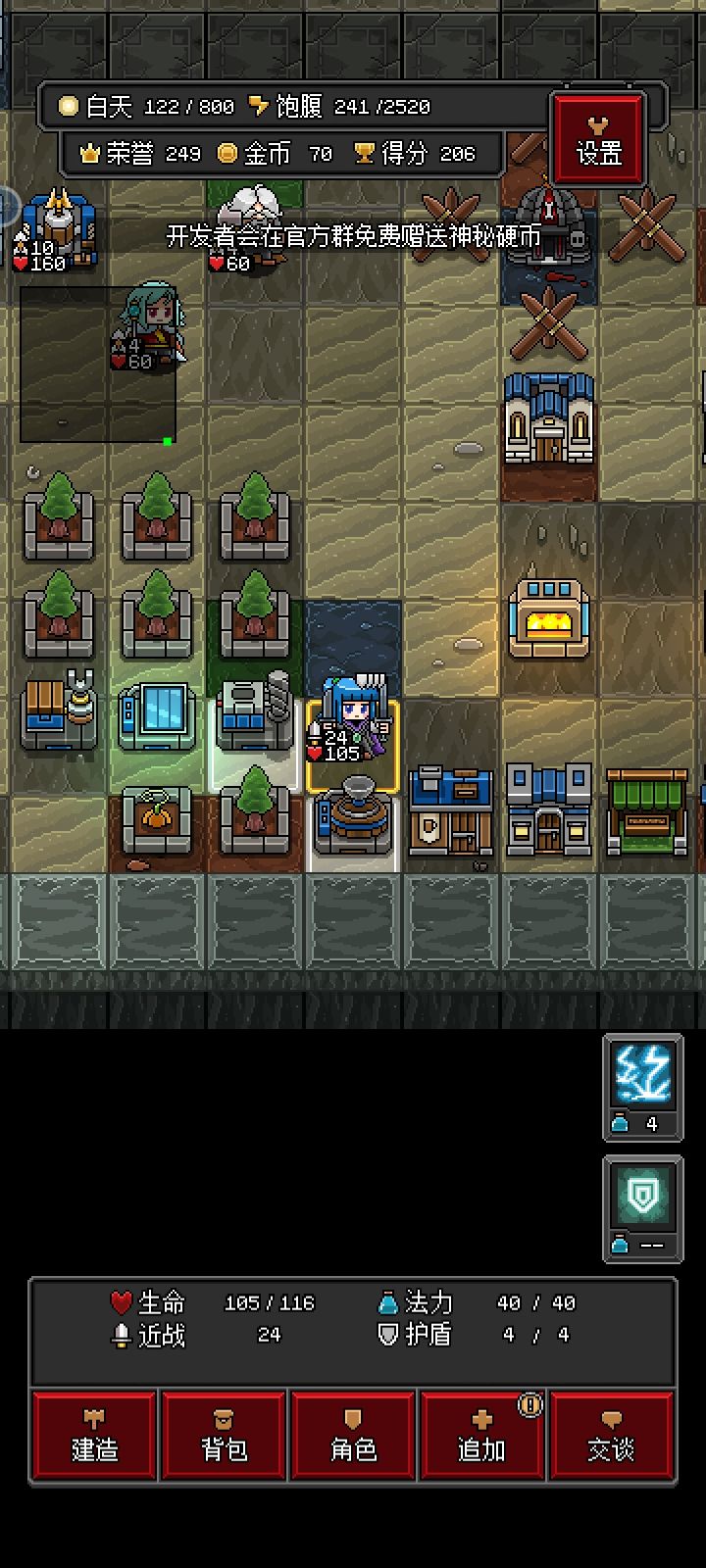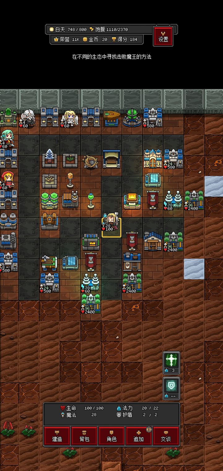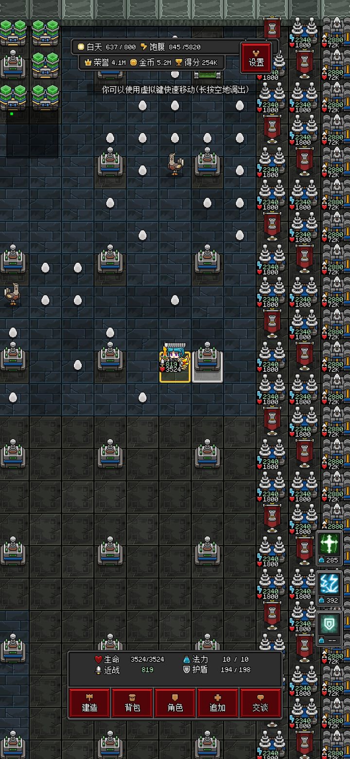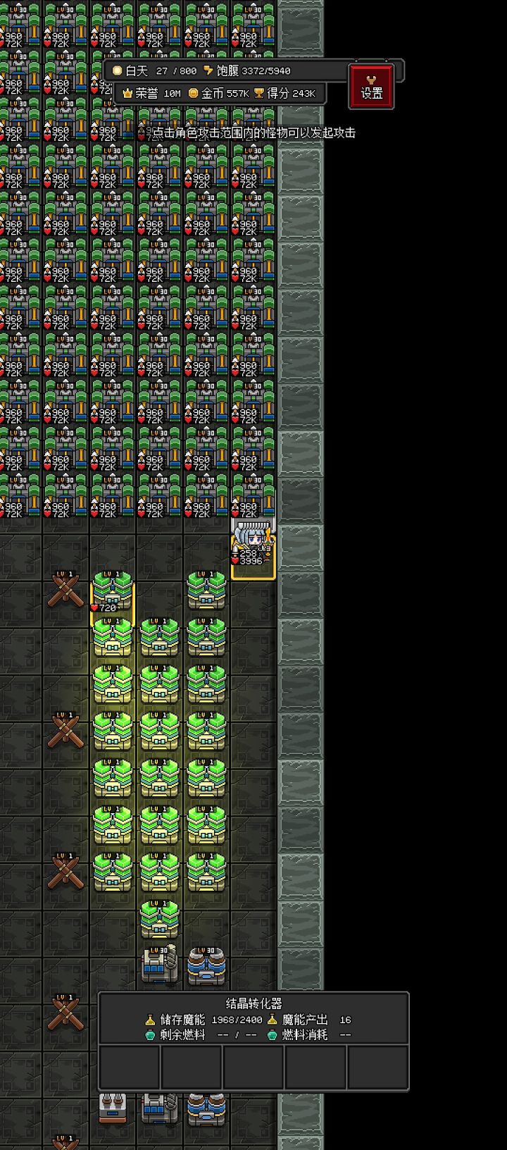 打完死神后,我就想着怎样把堕天使小姐姐请回家(这叫发掘沙盒游戏的趣味咳咳)。当时我的评分较高,刷新出的堕天使攻击力已经超过120(20级魔力屏障的修复极限)。我当时没想到解锁30级,直接重开了一局……重点看图中魔力屏障的布置。抓堕天使需要注意:1.评分不能太高,否则屏障修复跟不上(?存疑)2.要抓白天刷新出来的,晚上的会消失。3.魔力屏障的特点是:收到来自相邻十字范围的伤害,会反弹4点伤