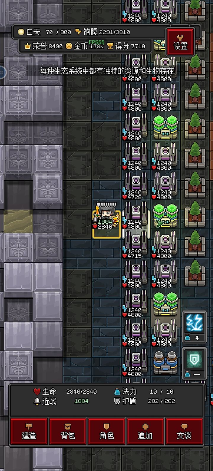 家不大,只占了不到整个地图的1/4,建的范围是20*18格,外围是满级20级魔力屏障,再之后是满级20级闪电发生器,后面的是20级的城堡战旗。每个口处安排了2个20级的烈焰塔之后就是里面,向上靠墙是20级太阳能电板+20级传输器,这是为了给外围电塔供能最右上的角落的传输器不跟靠墙的链接在一起,单独隔开一个3*3,是为了用燃油或者发酵燃料挖矿/合成魔能结晶再之后的养殖区跟种植区就很简单了,看