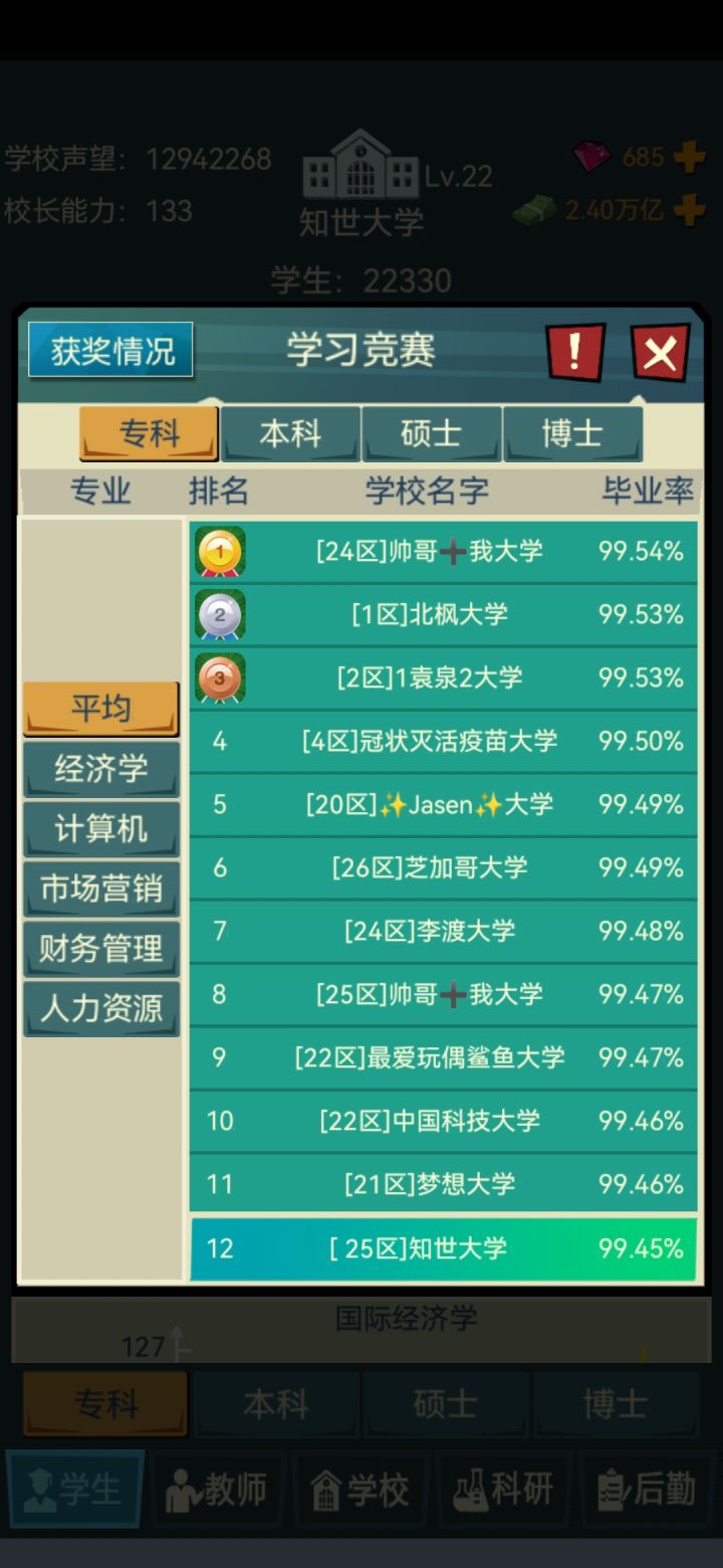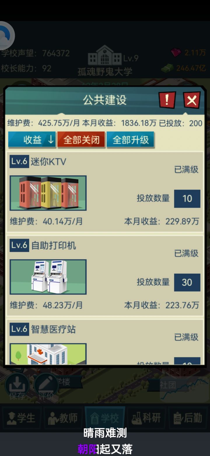 4.接下来说的是事务功能里的。事务里的招生全部拉最低,赚钱最重要。专业开设直接买完,钱够用。学校活动必须刚进游戏就点,不然你玩到后面之后才发现有这个功能的话你升级学校可以说是跟乌龟一样了该说不说。奖学金等你玩几年后再使,咱得存钱,公共建设也是开局就开始搞,摆渡车不要投放,这个开局很亏钱,直接扩建然后一直建造新的公共建设然后一直升级就行,一直升,一直建一直升,这个可以说是前期保命的了。时不时的就去看一下升级学校和高校建设需要的条件(升级学校的条件直接点开最顶上的白色学校图案),紧跟时事别忙着赚钱还待在低等级。