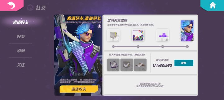 新手实践第一名,输入邀请码19mFm2qAh,可以领取为钻石与皮肤,邀请码填勾选项就在好友 ↑ 填取邀请码即可