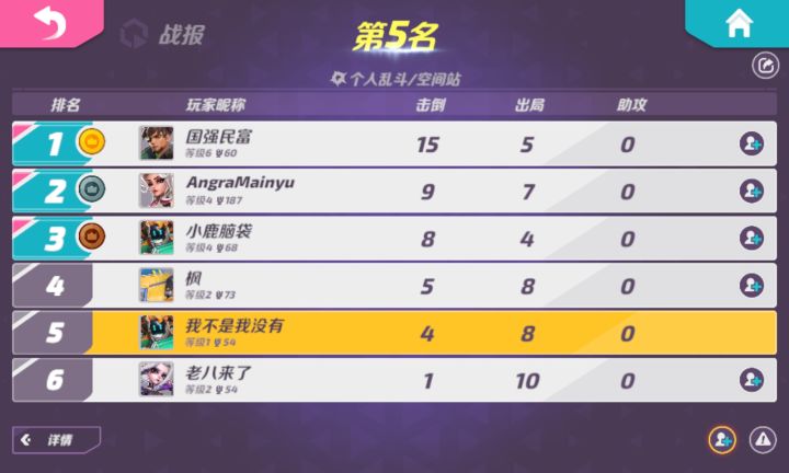 个人一点小小的建议:1匹配机制优化一下,老是单人碰到对面三个人组队,没沟通根本打不了。2个人乱斗,机制做好一点吧其他五个人最低都比我高两百多杯,最高都是两倍了,分段差距太大了。