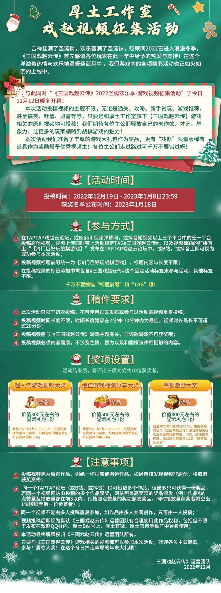 吉祥挂满了圣诞树,欢乐塞满了圣诞袜,眨眼间2022已进入浪漫冬季,《三国戏赵云传》首先感谢各位玩家在此一年中给予的热爱与支持!在这个洋溢着热情与欢乐地温暖圣诞月中 ,我们游戏内的各项精彩活动也正如火如荼的上线中。与此同时“《三国戏赵云传》2022圣诞欢乐季-游戏视频征集活动”于今日12月12日暖冬开幕!本次活动投稿视频的主题不限,无论是通关、攻略、新手试玩、游戏推荐,甚至搞笑、吐槽、避雷等等
