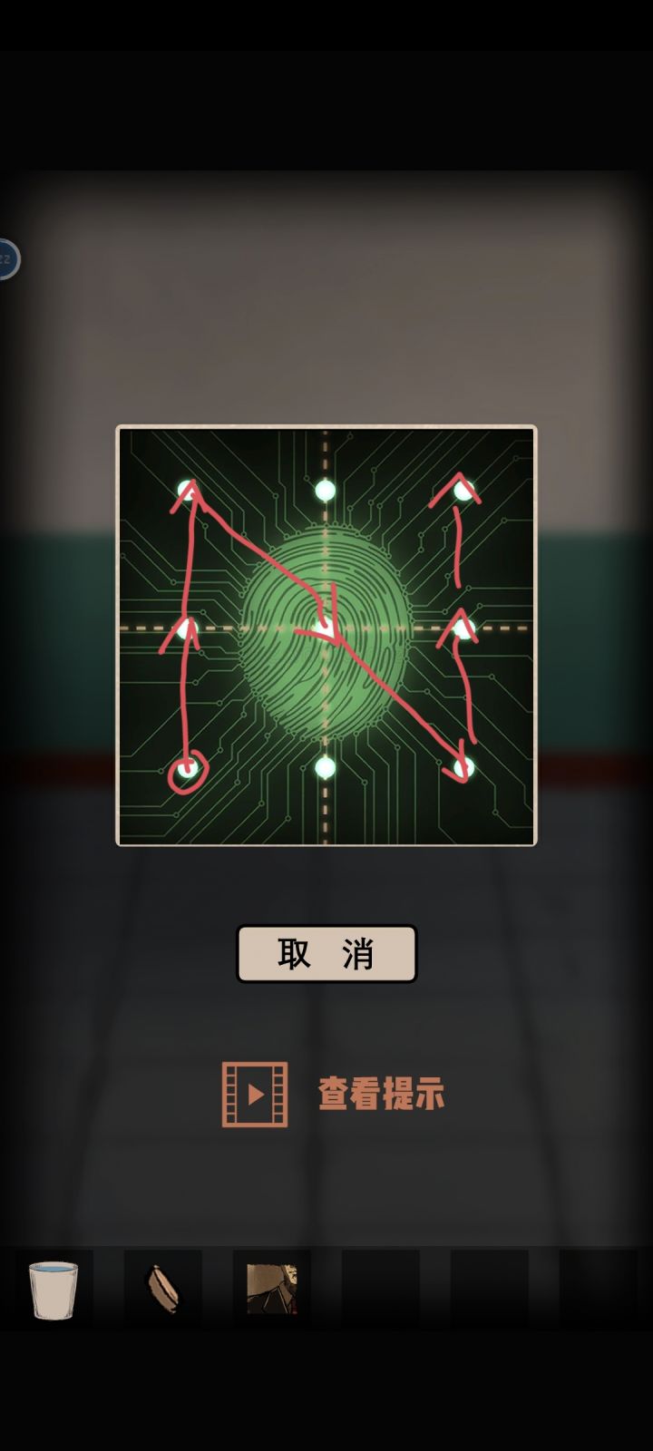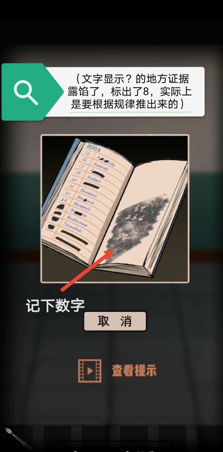 ①首先来到左边,桌子上的纸盒下面有一根铅笔,回到电梯前,在右上角的笔记本上用铅笔涂一下得到一组数字“64,256,8,16”,然后去到右边拿到一把钳子,去打开左边柜子上的铁丝,柜子里有一个盒子,根据电梯左上角的三个圆形和柜子上的杯子得到密码343,拿到钥匙打开电箱,拉下拉杆,电梯通电了,这时候可以看到笔记本下面写着2ⁿ,根据笔记本上的数字,得到n,即密码6835,②打开电梯,去往右边房间,桌子