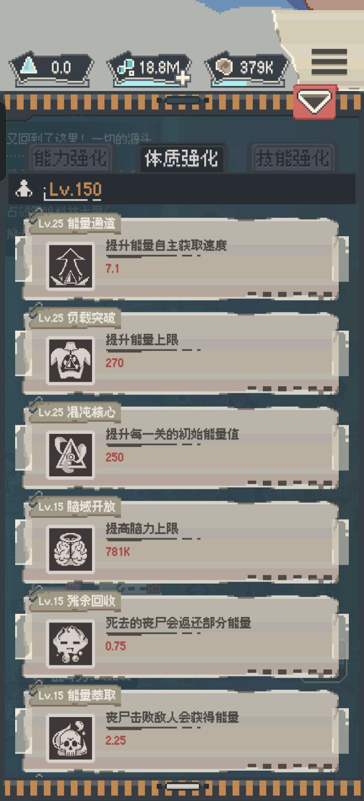 #浅评一下 # 我用的阵容是余烬,矿工,能量晶核。余烬尸海战术,清一半图后矿工和能量晶核捡资源。找不到身体强化,技能强化的,进入强化界面,在丧尸强化的同一条水平线上右移一些点点,他妈的他不给你标出来,颜色跟背景差不多,我打到第二章快完事才找到身体强化,吃了不少苦!技能前期不用管,尤其是不看广告的,后期资源多了在升,一级完全够用了。大部分关卡可以一力破万法,紫色怪物那关地图缩到最小,快进到两