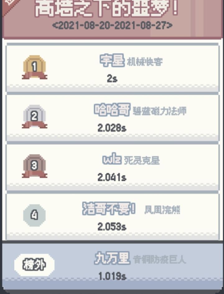 高墙之下的新纪录:1.019s,理论天花板应该是可以推到1s的,虽然不知道为什么我上不了榜就是了。