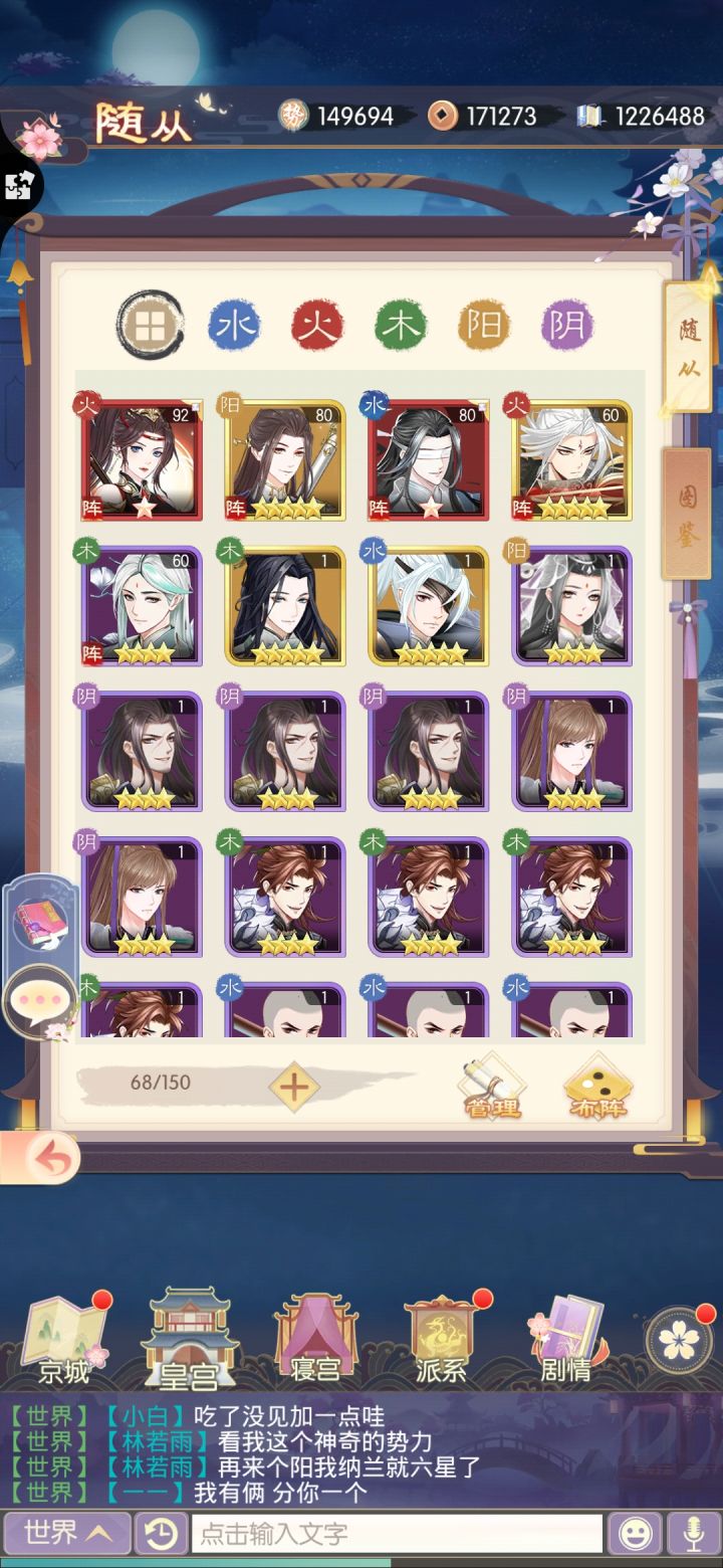 第一次写长篇,主要目的向官方反应一下目前游戏的缺点,未来发展方向。首先游戏的内容量,剧情,交互,衣服这些官方都值得表扬。下面提出一些建议:1.随从,从官方的角度看,五阴/五阳基本上是加成最高的阵容。但是目前的反馈是大家根本抽不到阴阳系的随从,四星的班超,鱼玄机,陈胜,李煜烂大街,五星的阴阳随从难碰到,玩家们就都发展成了五木,五水或四带一的阵容。(为了便于下面叙述,我将这几种随从命名为普四,