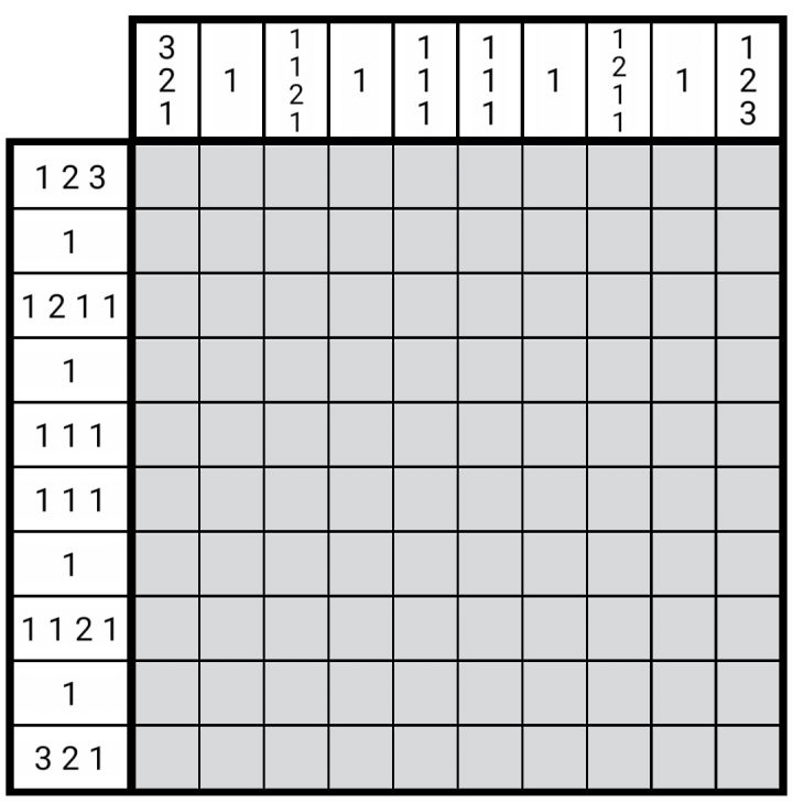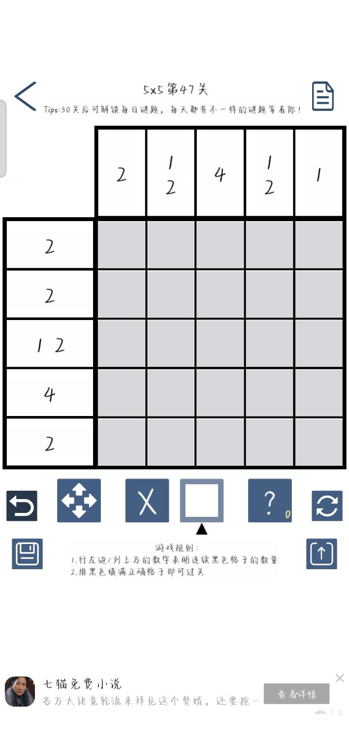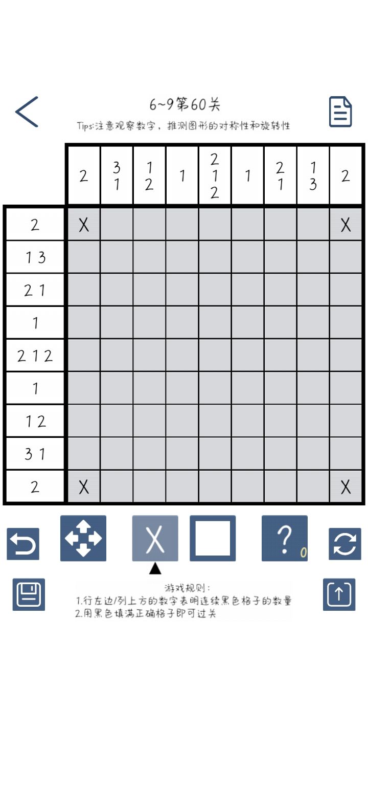9月30号的谜题给予我们的信息极少,若是用常规方法是难以确定正格的。这里我们使用一种新的求解方法。由于其的中心对称性。我们可以将其分为四个相同的区块,其中的图形一定是全等的。只是经过了90度的旋转。经过三次旋转后,你的延伸到区块外的图形将重新回到这个区块,并带有旋转270度的旋转。这样我们就可以通过矛盾来确定正格或负格了。举个栗子,我们从第十行看起,首先构造一个边缘状态图形,如下图所示。这里用叉标