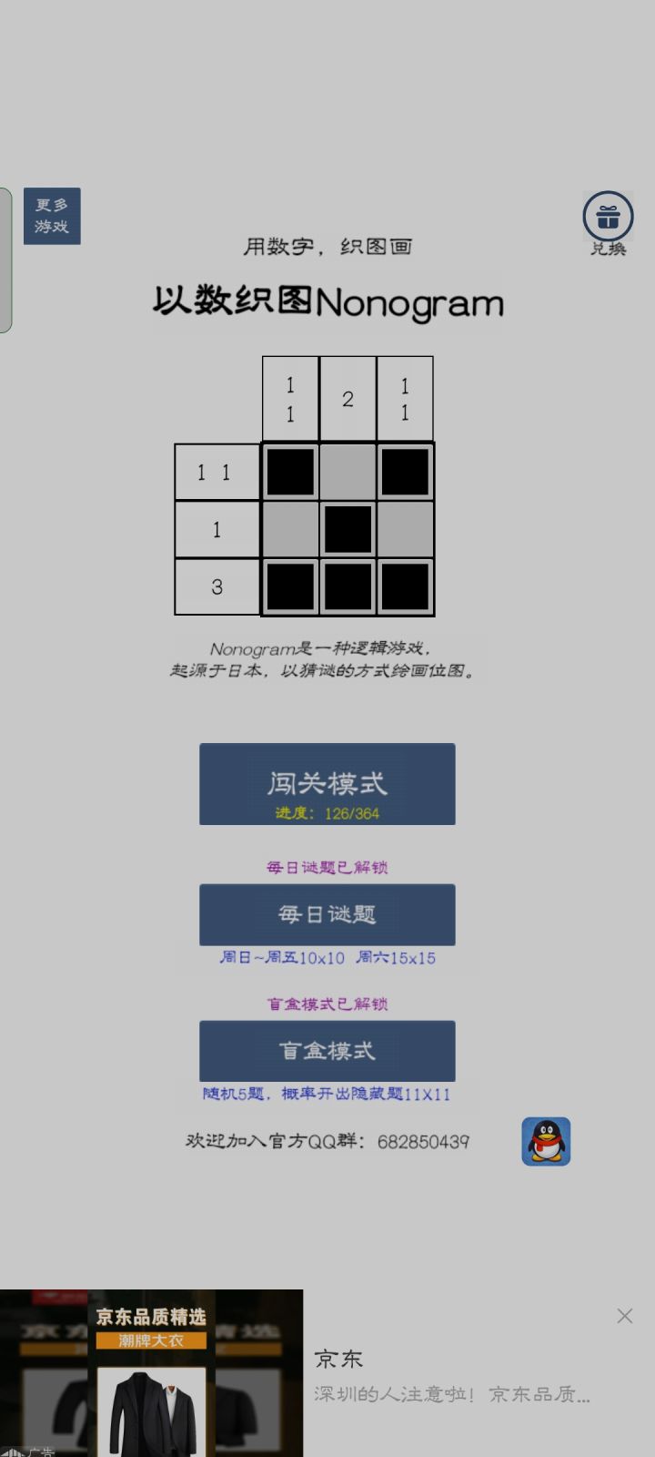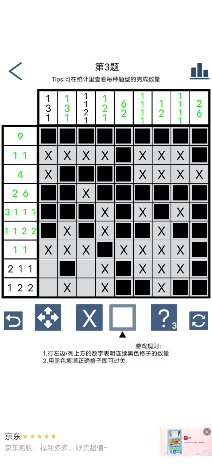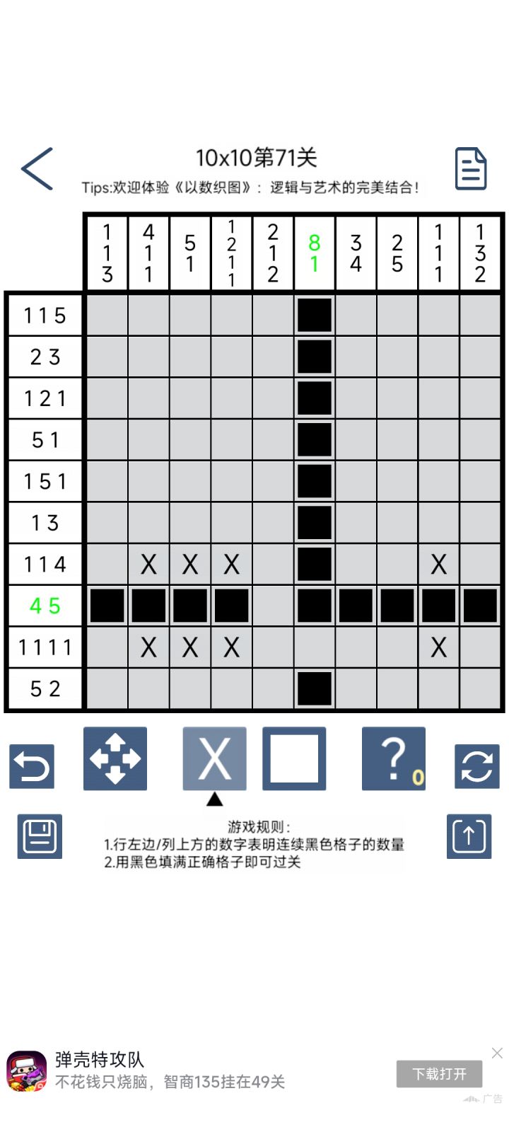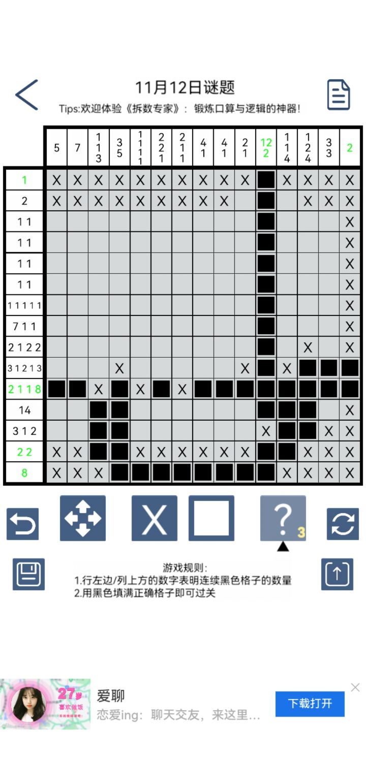 不谈好不好了,就这一种数织游戏,不好也得玩啊哈哈哈哈哈,总体上比较满意,几个点有些不顺手,一是偶尔会误触,但我会搞乱了误触的是哪一个点(这个我一时没想到好的解决办法,),二是希望当完全满足一个数字就绿一个数字,而不是这一行列完成了才标绿,最后就是希望能加一个空白选取框,有时候点某一格是想更清楚看清它所处的行与列(对,说白了我就是从3ds上的数织游戏来对比建议)