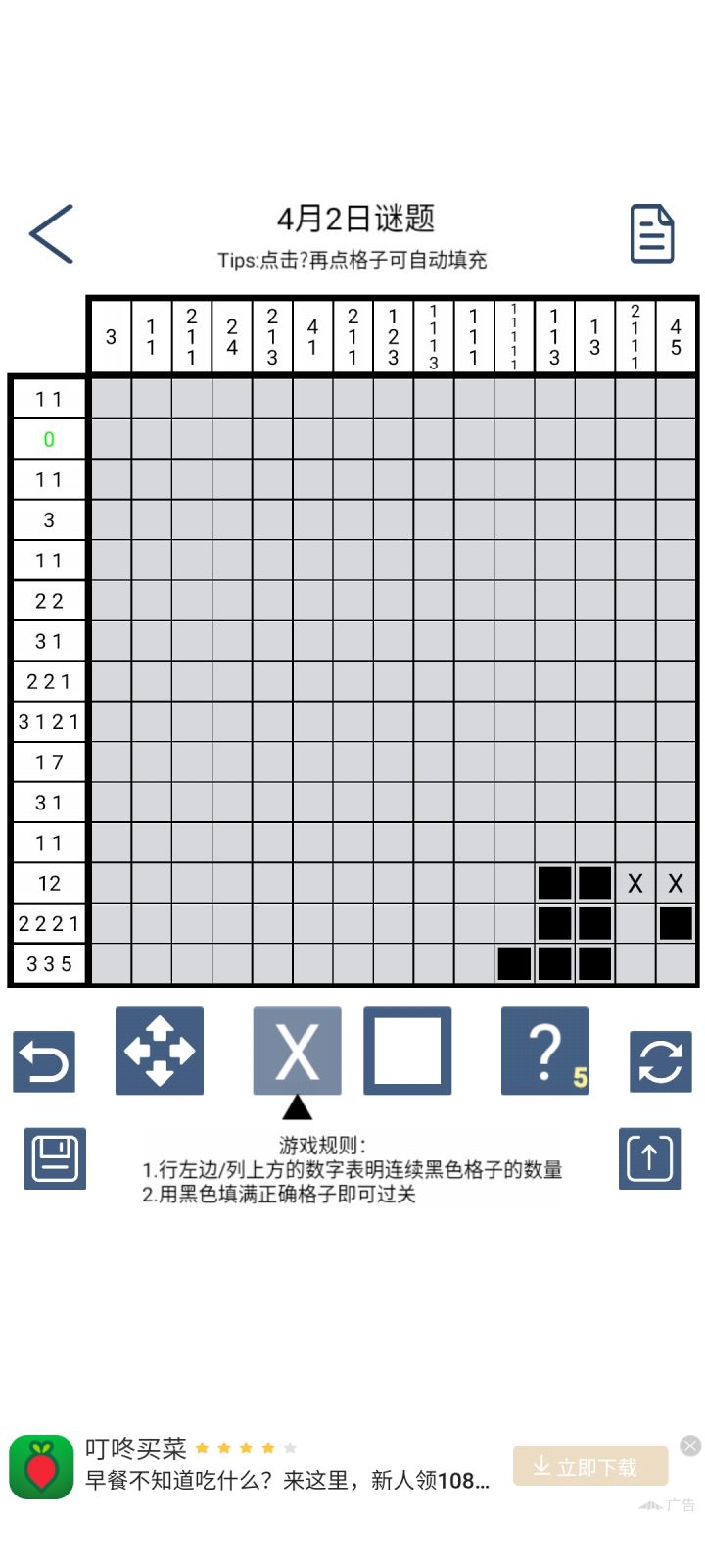 4月2号谜题有问题,下排335,横排倒数345格是必占,上面一个113,一个13,竖排2个倒数3格必占,右边2221,最后一格必占,12后面两格都不能占,最后的45不可能做到