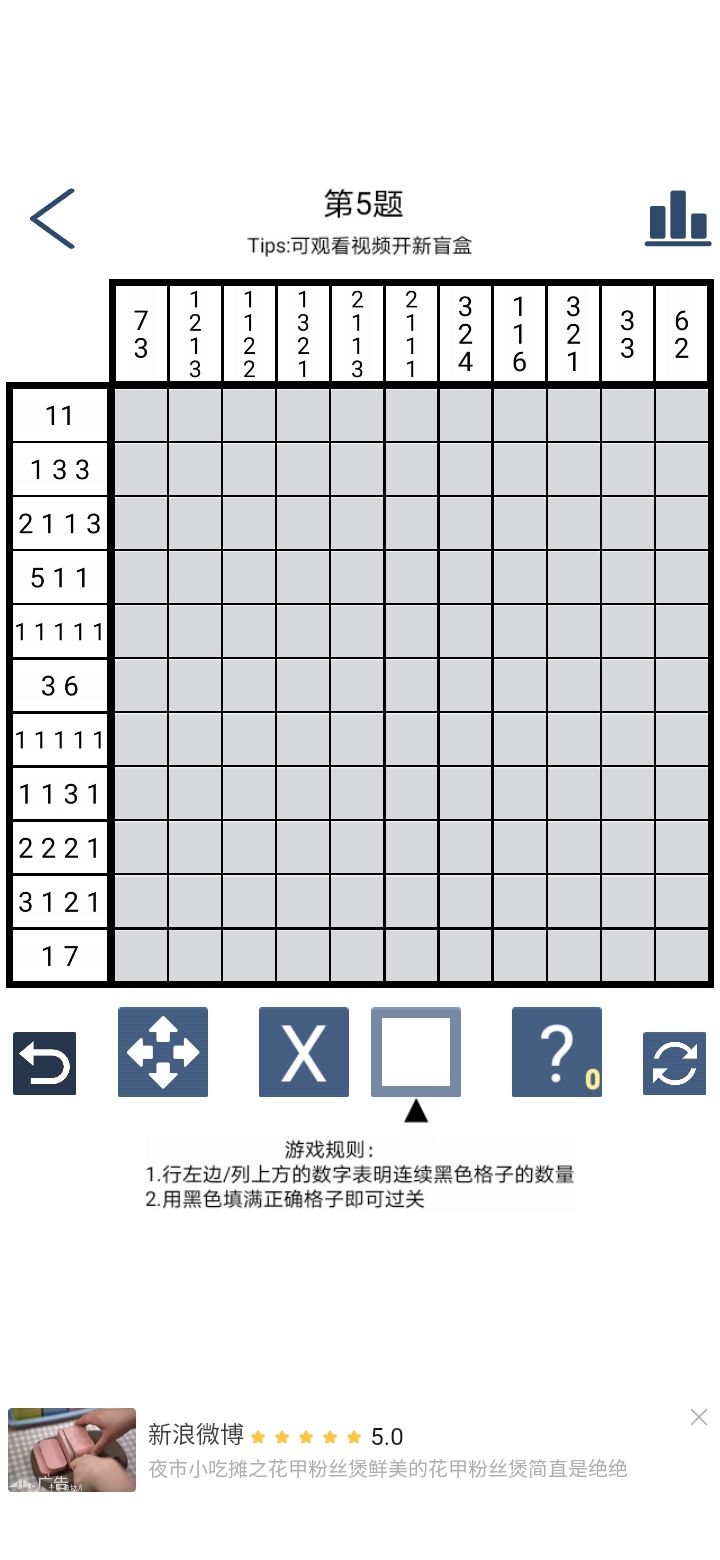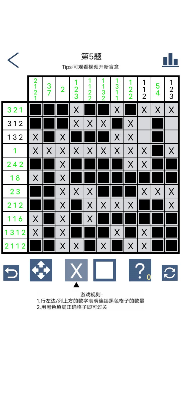 很喜欢这类型游戏,放松自己也开动脑筋。希望能增加点功能,操作也会更方便。比如1:自动填充,一行可填的填完了自动将该行空格其他的填x,可以按操作习惯选择是否开启2:线条上能做色彩深浅区分,比如比较大的图15x15的,所有线条不太好看,数也不好数,可以把分界做潜或者深,区分成5,5,5,这样看起来也好看,不然30x30的图眼睛受不了最后辛苦作者了,可以分享我们这么好的游戏,希望更多新意