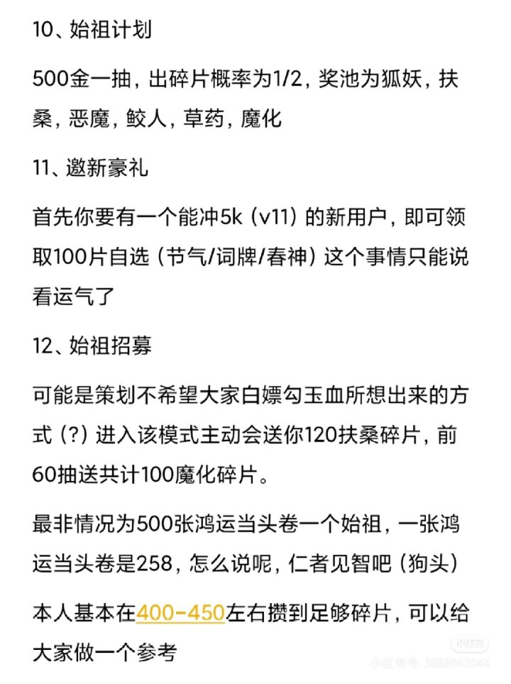 ❣️【关于只有新手才有的活动,一定不要错过】1.首充可以获得恶魔始祖2.累充5天可以获得鲛人始祖3.激活至尊月卡可以获得魔化始祖4.七天任务活动可以获得草药始祖5.新人特惠一元可以获得一套服装6.新手保护期可以用金锭寄售缘分7.邀新助力好友过完新手指引马上绑定8.新服福利:a.签到七日可以获得草药羽卫和扶桑侍臣;b.祈愿或招募到一定数量可以得到某一类的羽卫和始祖以上均根据当时官服