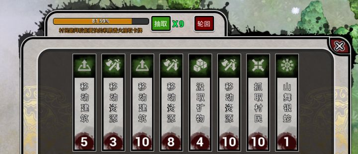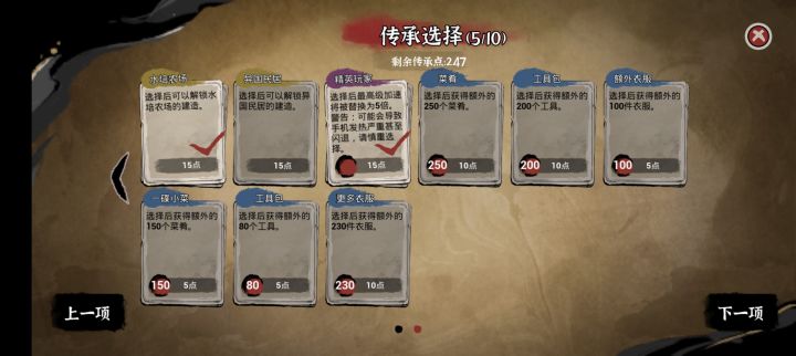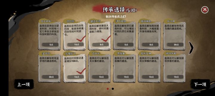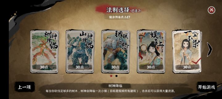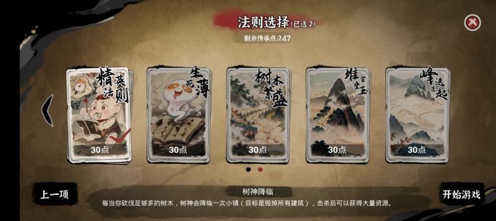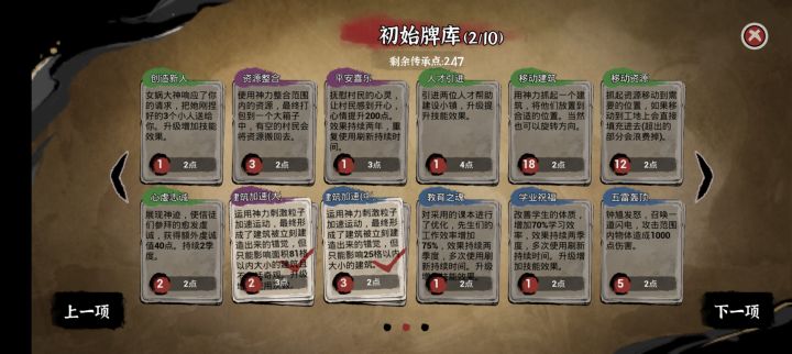 还是之前那个,第一项的加速卡性价比还是比较高的,第二项四合院是就是高级住房,不用放摆件啥的就能快速生娃,移速是必选的,这不用说吧!安卓加速也点上,因为新手开局主打就是快速入门!精英法则跟不尘能稍微快点培养出高效工具人!因为是新手传承推荐开局,不会说明刷卡,跟神权卡推荐选择,普通难度也还好,不用那么麻烦,不用神卡也能比较快速到达15级(想第一次玩就完成这个成就,可以不选第一项的两个加速卡)!最后当然