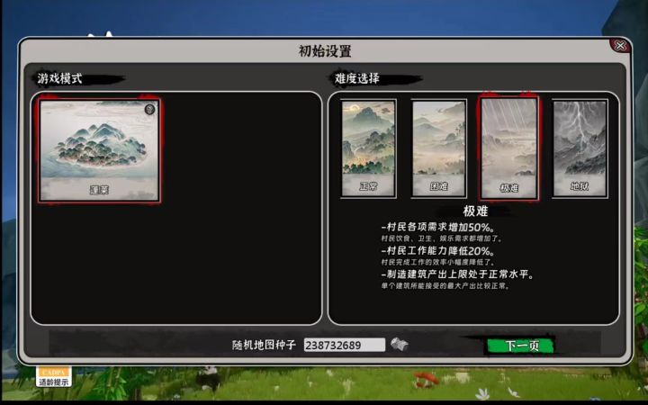 难度 推荐正常(主要是为了刷成就)如果大佬想挑战一下也可以选择别的正常难度也不是很简单因为人口会不够,刁民们的要求也多。困难难度娱乐需求的增大会使工作效率降低。极难难度娱乐增加,工作能力降低。村民的工作可能就是一天就上三个小时班其余时间全摸鱼。地狱模式,就是他们八个小时工作制七个小时摸鱼,你还要用这一个小时的物资养活他们。2初始设置的选择地图选大,小地图和中地图没有可玩性,感觉改了之