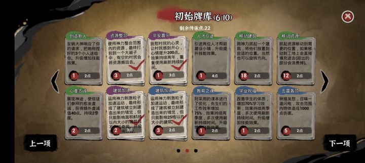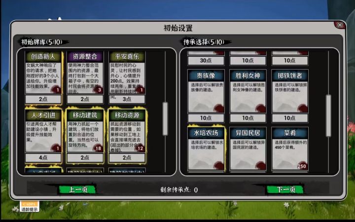 开局后神权那里有四个神像,可以用来解锁神,神解锁后就可以获得神庙,神庙自带虔诚点数。白帝:总结下来就是居民的衣食住工的卡牌加成。青帝:总结下来就是农业与矿业卡牌加成与生成。赤帝:总结下来就是居民的饱腹娱乐与生死的卡牌。黄帝:总结下来就是移动速度成长速度人口增加与消灾。蚩尤:总结下来就是坏蛋,但可以召唤妖兽,打败后获得物品。我主推荐升,青帝与黄帝,但要小心别的神的神怒(应该可以用烧香解除