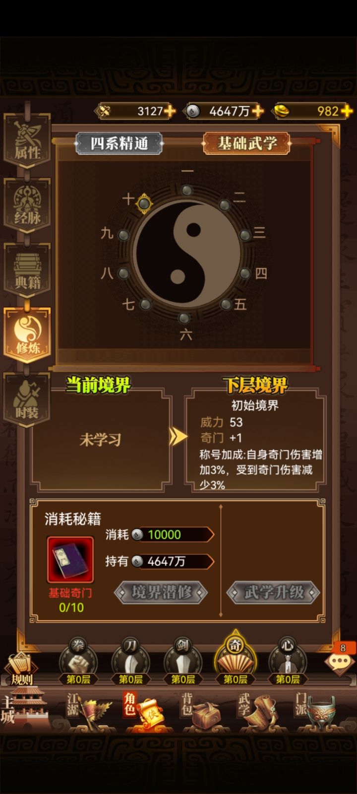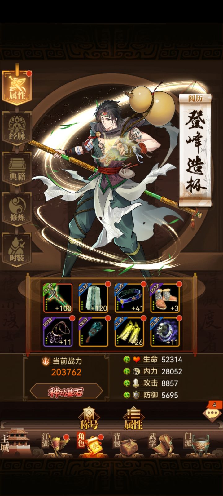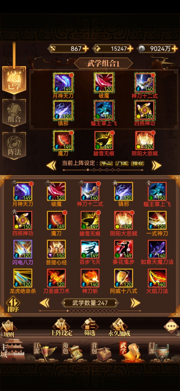 大噶好,我是来自武极化宗17区的萌新滚刀天选骚年,目前是一名v14神刀门萌新。感谢tap有这么一个舞台能让我和大家分享以下一个有意思的武学道路,抛砖引玉,希望这游戏能做得越来越好吧。1.月神天刀套放在一号位月神天刀套主打禁驱,非常关键的一套武学,用来保住四照神功的主动效果buff,滞身及蝠王草上飞的一速效果,这样能让神功套效果最大化,即使对面上了斗转,150菩提心经乃至流星剑法来针对你,你依旧可