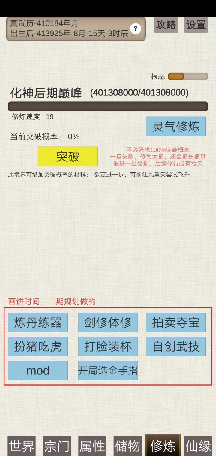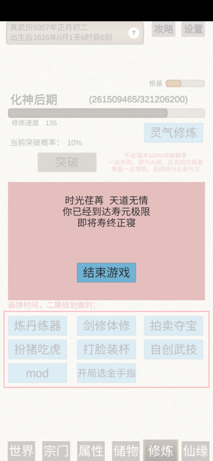 玩这个游戏玩了半天,结果就差那么一点就可以化神后期巅峰,希望这个游戏可以让我们存档,这样就不至于到最后就死掉,要从头再玩,如果有存档,我可以按照自己的想法,把每个选项都选一遍。