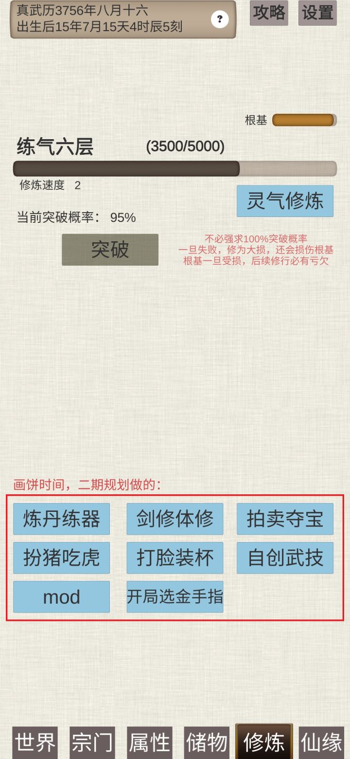 界面:商店界面缺少批量出售和批量兑换,属性界面没有自己的战斗属性。功法:武技的加成是固定数值,导致武技不是太强就是太弱。应该把武技按攻击力加成。