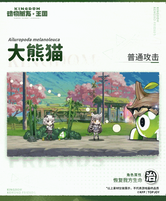 亲爱的浮莲子:今天为大家带来的是大熊猫的实装展示哟~“嗜睡”少女大熊猫在战斗时,会浮现出在竹林中的场景,并在休憩的过程中为同伴们带来温暖和治愈的效果。🐼“不要妨碍我喔喔喔喔喔!”🐼*以下素材仅做展示,不代表游戏最终品质。普通攻击:奇迹展示:胜利动作: