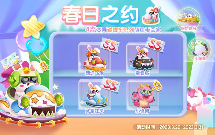 活动总览1. 飞车侠及4态变异碰碰车系列萌鱼上新;2. 小怪兽玩偶系列萌鱼扭蛋机限时返场;3. 参与活动领限定头像、头像框、称号奖励。叮叮叮!三月踏春去哪里?当然到萌鱼游乐场更有乐趣啦!游园、钓鱼、盲盒惊喜...还可以和飞车侠和小怪兽一起玩耍快来查看游园活动要点~萌鱼上新萌鱼返场——(小怪兽)五颜六色的返场小怪兽玩偶泡泡都快挑花了眼!还在做什么选择?当然是通通都要带回家!另