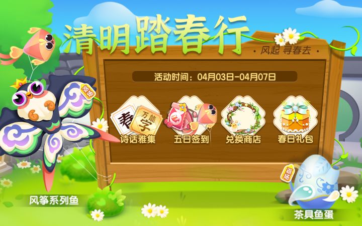 活动总览1.春日诗话活动风筝鱼、茶具鱼蛋返场;2.小马座、后发座、精卫觉醒人物上新;3.心曜契约上架“零落花语”装扮。即将进入阳光明媚的四月,大家是否感受到春意暖暖的氛围啊?正值春日好时节,心中不免想吟诗作曲一番泡泡精心筹备了一场诗话会,恭候大家光临啦~萌鱼返场清明踏春五日签到开启春日踏青活动,五日签到奖励多多!除了返场萌鱼外,随机诗字和诗册(用于商店兑换奖励)也是本次活动很重要