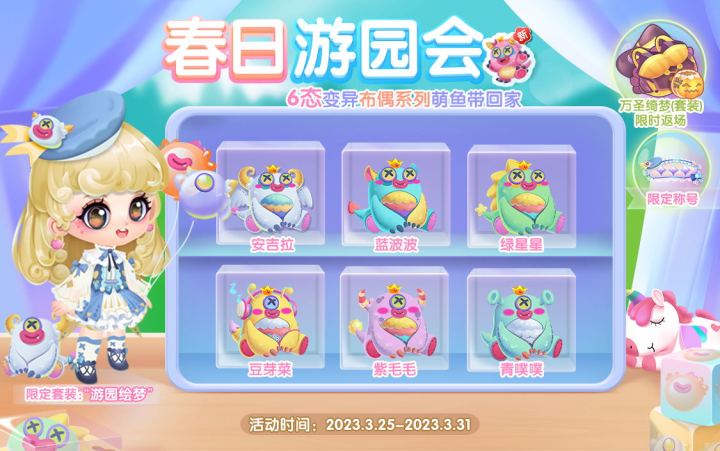 活动时间:3月25日0点—3月31日24点具体活动时间以游戏更新为准 新活动新爆料欢迎锁定泡泡~今来到春日游园会现场打卡各个活动,快跟随泡泡一起邂逅游园会体验游园魅力吧!小怪兽要登陆萌鱼星球啦,听说还带着TA的6个SS级变异小伙伴,点击开启盲盒由馆长亲自揭晓~小怪兽(S级)获得方式:萌鱼盲盒机、游园打卡、游园小铺获得方式:装扮盲盒、游园手册(部分单品)游园助力 01游园打卡游