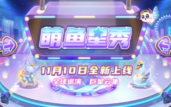 活动总览上线时间:11月10日开启具体活动时间以游戏内更新为准万众瞩目的星秀巡演大赛即将开始,全新舞台秀场,带上萌鱼在灯光下展示高光时刻!还可解锁萌鱼培养新玩法,提升萌鱼等级为萌鱼星秀舞台助力!泡泡已经搬好小板凳,坐等“好戏开场“咯~元气套装获得方式:萌鱼星秀完成【1、2】章节奖励蔚蓝套装 获得方式:萌鱼星秀完成【3、4】章节奖励 (星秀巡演)玩法:1.萌鱼星秀比赛以观赏度高低进