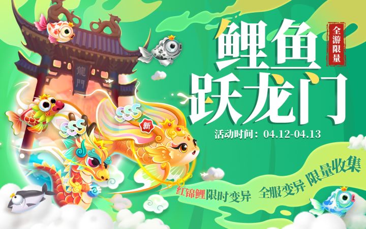 锦鲤跃池光影起,福满腾飞自成仙!相传龙门大开的时候,总有一群锦鲤跃跃欲试想逆天改运; 部分锦鲤一蹴而就化身辰龙,也有锦鲤幻化成鱼身鸟翼名唤“仙蠃”!锦鲤们还变幻出了各种新形态,虽然没有成功,但也都完成了自我蜕变! 想拥有的心藏不住啦!快让泡泡也蹭蹭好运~对了,神鸟涅槃活动也将迎来新萌鱼!萌鱼上新神鸟涅槃跃龙门玩法介绍红锦鲤在升阶为皇冠期的时候有机会发生变异~跃龙门成功后将能获得锦鳞凝元,