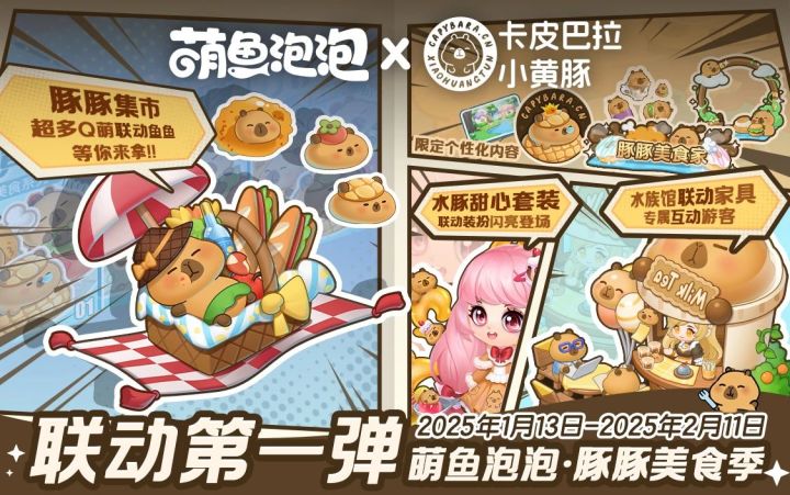 活动总览1. 豚豚美食季限时上新19种新萌鱼;2. 活动上新“水豚甜心”“豚门永存”联动装扮;3. 参与累充得“豚豚甜品森林”鱼池背景;4. 水族馆上新游客“甸鸢”及专属互动家具“豚豚奶茶小铺”;5. 萌鱼泡泡 X 卡皮巴拉 活动直播。报!!远处海岛发现一处豚豚美食集市~准备好迎接一场前所未有的联动萌鱼盛宴!新图鉴、新背景、新装扮、新游客...不仅美味满分,收获也能满满当当~活动限时!