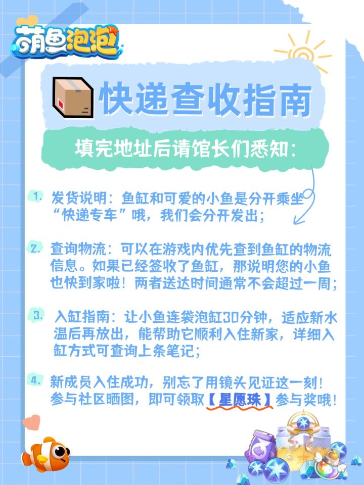 亲爱的馆长们,填好地址就坐等收货吧!这里有几个小提示请查收~#萌鱼泡泡 #萌鱼泡泡养鱼送真鱼 #萌鱼泡泡创作官 #萌鱼泡泡快乐养鱼