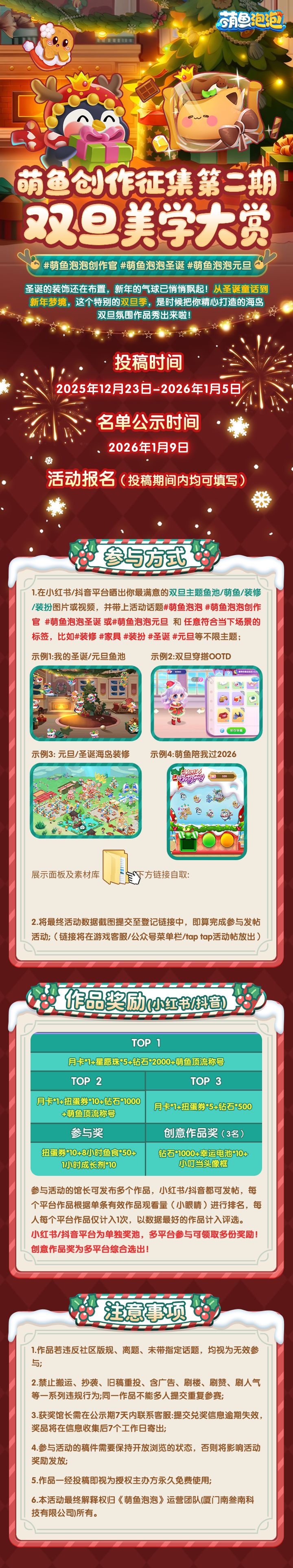 作品数据登记链接:https://wj.qq.com/s2/25313204/740y/萌鱼素材领取链接:https://pan.quark.cn/s/f016ec9f5aeb#萌鱼泡泡 #萌鱼泡泡创作官 #萌鱼泡泡圣诞 #萌鱼泡泡元旦