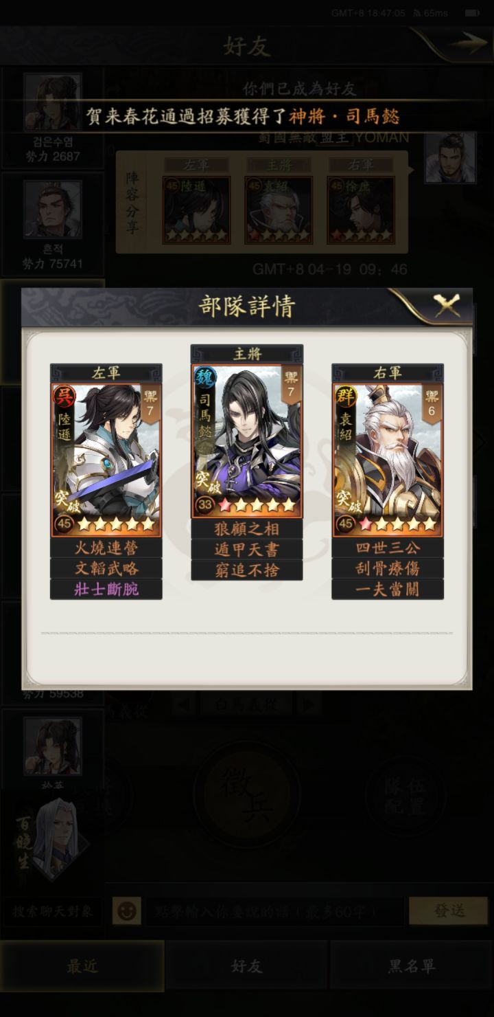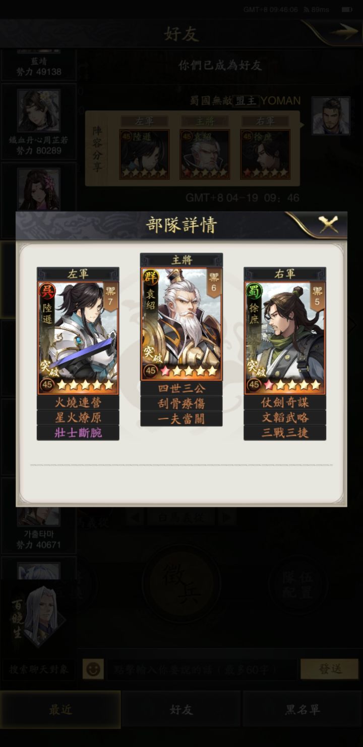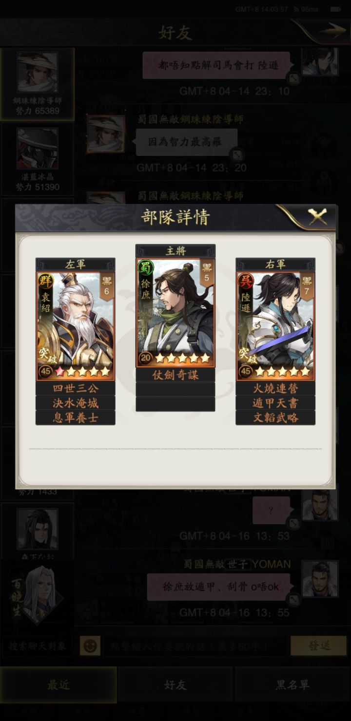 我说桃园能打三势陆白板也没人信,那我就上战报吧。今天正好有人突我脸上,我也正好实验能给你们看看战报。一共对决8次,先4次他是诸葛亮当主将,2胜2负,后来他就换了袁绍当主将。也是2胜2负。本来我是想打10次的再来看的,但是体力不够就此作罢。他的士气比我低几点,但是他的星星兵数都比我高,他在霸业盟,我在落匪状态,他科技应该也比我高。我的技能就是把原关羽五虎转到了桃园身上(不出意料的话我应该是第一个这