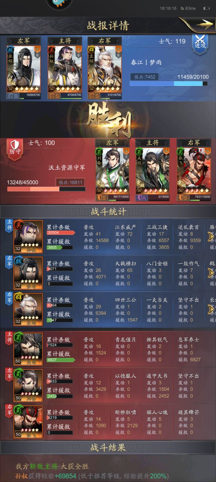 孙权三战逆乱有条件的小伙伴可以换成计斩妙才,张郃一鼓八门也是拉起孙权的活性也可以保住自身有条件得小伙伴可以不要八门要一手横扫增加伤害,袁绍带一夫当关防止孙权被爆头额外增加袁绍统率增加袁绍的坦度和回血奶量坚守只要是怕扛不住才用的有能力的可以换成挫其锐气减少对面回血,我这套阵容可以打没有发育成型的汉马汉菜哦阵法的话就是s2的朋友听啦,阵法孙权带雁行阵,张郃带鹤翼阵,袁绍带长蛇阵,孙权带雁行阵主加追击
