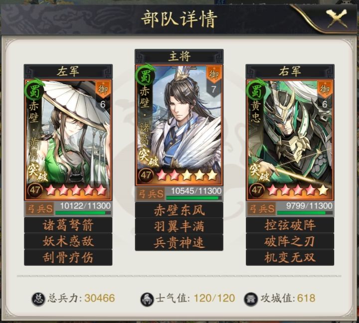 系统:安卓区服:荣耀服 挫其锐气游戏ID:122CE33955F游戏名:狮子头零充今天给大家带来一队爆发队。那就是赤壁诸葛月英黄忠。也许也有人组过这套阵容,但我这套技能是我以自己打架经验组成的。首先这是技能配置。这队输出主要靠的是黄忠主技能的会心爆发,机变让黄忠开局爆发伤害提高30%让其更容易开局秒一人,破阵减对面统率智力。(也可以换成万箭、横扫我都试过不过伤害不能最大化)。月英带刮骨防